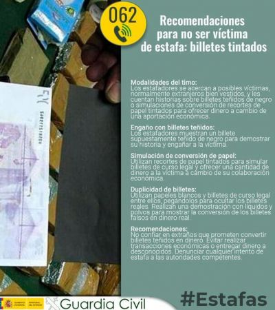 Die Guardia Civil warnt vor Betrügern, die sich mit einer neuen Masche vor allem ausländischen Urlaubern nähern. Sie geben vor, mit schwarzer Tinte verschmutzte Geldscheine wieder in echtes Geld verwandeln zu können. Dazu fordern sie einen Geldschein von ihren Opfern. Offenbar sind schon viele in die Falle getappt. Die Polizei rät: Seien sie misstrauisch, wenn sich ihnen eine Person mit solch einem Angebot nähert und händigen Sie niemals Geld an Unbekannte aus! Melden Sie es der Polizei, wenn Sie Opfer eines Betrügers geworden sind.