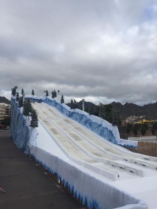 Viele Stände und Buden sowie Fahrgeschäfte und Überraschungen gibt es jetzt in der Stadt Santa Cruz zur Weihnachtszeit. Die größte Überraschung ist aber nahe der Plaza de España de Santa Cruz de Tenerife. Dort gibt es eine 6,25 Meter hohe und 35 Meter lange Rutsche im Motiv einer Eisbahn. Darauf kann man mit Autoschläuchen hinunterrutschen.