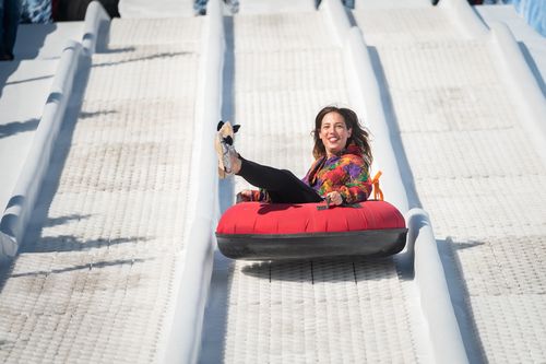 Dort gibt es mit Buden insgesamt 130 Attraktionen, auch eine simulierte Eisrutschbahn. Die Bürgermeisterin liess es sich nicht nehmen, diese eigenhändig auszuprobieren und hatte viel Spaß dabei.