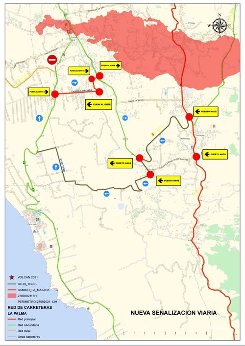 Nachdem die Lava in der Nacht zum Mittwoch die Straße zur Küste überquert und damit unpassierbar gemacht hat, hat die Inselregierung eine alternative Zufahrt ins Aridane-Tal ausgeschildert. Der Verkehr wird nun zur Küste über die Straße zwischen der Plaza Bonita und dem Tennisclub geleitet,  die Ausfahrt erfolgt über die Straße, die vom Restaurant La Mariposa zum Camino Marta führt.