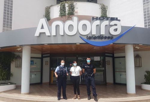 Zwei deutsche Polizisten, Corinna Verena Feldhaus und Romain Tardiere, sind im Juli mit den Kollegen der Guardia Civil von Adeje im Einsatz. Sie stehen in der Urlaubssaison deutschen Urlaubern als Ansprechpartner zur Seite. Sie sind im Drei-Sterne-Hotel „Andorra“, nur wenige Gehminuten vom Strand entfernt, untergebracht.