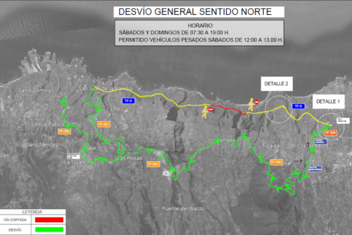 Wegen dringender Absicherungsarbeiten wird der Inselring TF-5 zwischen Los Realejos und La Guancha für den Straßenverkehr zwischen den Punkten 39+500 und 48+500 gesperrt. Der Verkehr wird über La Guancha/Icod El Alto umgeleitet. Die Sperrung erfolgt am 8./9. Juli sowie am 15./16. Juli zwischen 7.30 Uhr und 19 Uhr. Eventuell, je nach Fortgang der Arbeiten, wird die Sperrung am 30./31. Juli wiederholt. Schwerverkehr kann samstags im Zeitfenster von 12 bis 13 Uhr passieren.