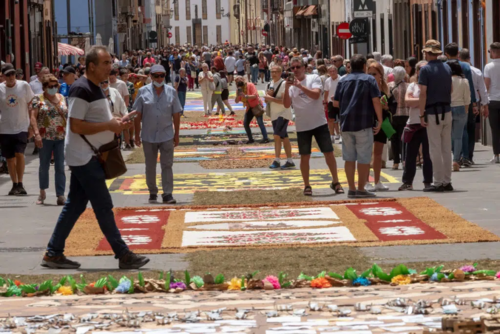 Aus gefärbtem Sand, Blumen und anderen Naturmaterialien werden zu Corpus Christi in der Altstadt La Lagunas Teppiche gelegt. Auch am vergangenen Sonntag zierten über 40 Teppiche den historischen Stadtkern. Nach zwei Jahren Pandemie freuten sich die Bewohner und Besucher der Stadt, dass die alte Tradition wieder stattfinden konnte.