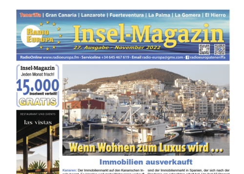 Seit Mittwoch wird die November-Ausgabe des Insel Magazins verteilt. Durch den Feiertag mit einem Tag Verspätung. Lesen Sie wie teuer das Wohnen auf den Kanarischen Inseln geworden ist, erfahren Sie, wo es die nächsten Kunstausstellungen gibt, holen Sie sich Tipps für einen Waldspaziergang oder welche Traditionen und Veranstaltungen im Herbst geboten werden. Innerhalb der nächsten drei bis vier Tage wird das Insel Magazin an den üblichen Verteilerstellen angekommen sein.
