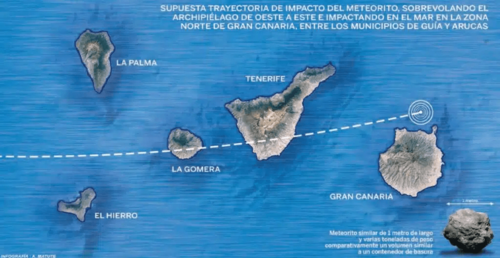 Ein rund ein Meter langer und mehrere Tonnen schwerer Meteorit flog am Mittwoch über La Gomera und den Süden Teneriffas hinweg, um nördlich von Gran Canaria im Atlantik einzuschlagen. Die Menschen im Norden der Insel spürten eine starke Vibration, die Türen und Fenster beben ließ. Auch das nationale geographische Institut fing um 15.35 Uhr sogenannte N-Wellen auf, die entstehen, wenn natürliche und künstliche Objekte mit Ultraschallgeschwindigkeit in die Erdatmosphäre eindringen. Glücklicherweise wurde niemand verletzt. Der Ursprung des Meteoriten ist unbekannt.