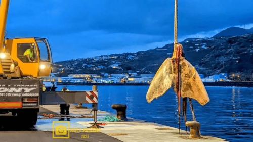 Ein zehnköpfiges Team der Universität Las Palmas hat am Montag versucht, den Pottwal zu bergen, der am Sonntag an der Playa de Nogales in Puntallana gestrandet ist. Bei dem Versuch, den 20 Tonnen schweren Koloss abzutransportieren, brach die Schwanzflosse ab. Das Tier ist seit über 48 Stunden tot und der Verwesungsprozess hat begonnen. Deshalb wurde beschlossen, die Obduktion direkt vor Ort vorzunehmen, was die Arbeit erschwert, aber die bessere Alternative ist.