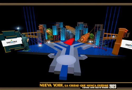 Die Karnevalsbühne 2023 wird rund 2.000 Quadratmeter und acht Bildschirme à 210 Quadratmeter umfassen. Als Kulisse für das Motto „New York – die Stadt, die niemals schläft“ wird die Skyline von Manhattan auf den Bildschirmen erscheinen. Mal fühlt sich der Betrachter mitten im Central Park und mal direkt auf dem Times Square.