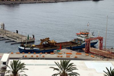 Ein Spezialschiff arbeitet derzeit an der Hafeneinfahrt des Hafens von Santa Cruz de la Palma. Hier wird die Fahrrinne vertiefert, damit auch größere Containerschiffe und Kreuzfahrtschiffe im Hafen anlegen können. Die Arbeiten sollen in zwei Monaten abgeschlossen sein. PG-AR