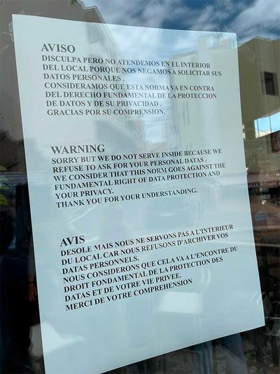 Obwohl viele Gastronomen darauf warten, endlich wieder Gäste in ihren Lokalen bedienen zu dürfen, sind in der Innenstadt von La Laguna immer öfter Hinweise in der Tür zu sehen, in denen die Wirte freiwillig auf den Service im Innenraum verzichten. „Wir weigern uns, die persönlichen Daten unserer Gäste aufzunehmen, weil wir der Meinung sind, dass diese dem Datenschutz widerspricht“, steht dort zu lesen.