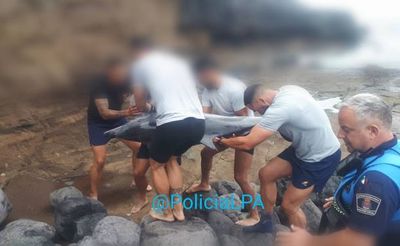 Am Freitagvormittag wurde am Strand El Confital in Las Palmas ein toter Delfin angeschwemmt. Soldaten der Artilleriegruppe RAAA 94 halfen der Lokalpolizei das Tier zu bergen und abtransportieren zu lassen.