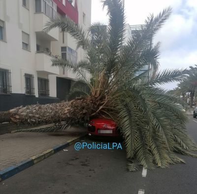 In der Calle Málaga in Las Palmas fiel am Freitag eine stattliche kanarische Palme einfach um und stürzte auf ein am Straßenrand geparktes Auto. Glücklicherweise entstand nur Sachschaden, Menschen wurden nicht verletzt. Die Lokalpolizei koordinierte die Aufräumarbeiten.