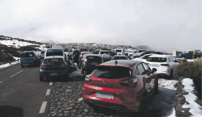 Hunderte Autofahrer parkten ihre Autos am Wochenende einfach an den Straßenrändern und teilweise in zweiter Reihe um sich ins Schneevergnügen zu stürzten. Die Polizei machte Filmaufnahmen. Diese Parkweise kann mit einem Bußgeld belegt werden. Vor allem leidet der Teideginster (Retama Sphaerocarpa), der im Naturschutzgebiet wächst und von den Autos platt gefahren wird.