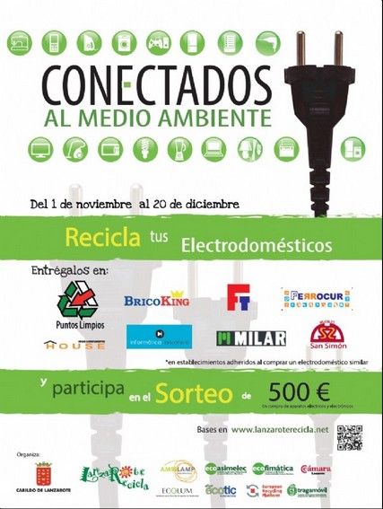 Auf Lanzarote gibt es wieder die Aktion „Conectados al medio ambiente“ (Mit der Umwelt verbunden) bei der man zwei Gutscheine für 500 € gewinnen kann. Wer mitmachen möchte muss nur ein Elektrogerät vom 1. November bis 20. Dezember neu kaufen und das alte dafür bei den teilnehmenden Geschäften abgeben – oder aber bei einem der Recyclinghöfe auf Lanzarote - „punto limpio“. Unter den Teilnehmern werden zwei Gutscheine für je 500€ verlost. Die teilnehmenden Geschäfte sind Hogar & complementos, HOUSE, Brikoking, Ferretería Tías, Muebles San Simón, Ferrocur, Milar und Informática Lanzarote. Als Elektrogerät zählt jedes elektrische oder elektronische Gerät, das per Stromkabel oder Batterien betrieben wird. Also vom kleinen mp3 player bis hin zum Riesen-Kühlschrank.