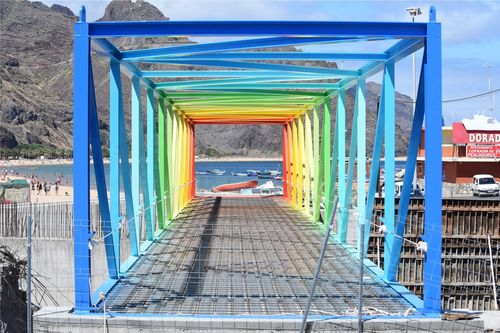 Ein buntes Eisenkonstrukt wie eine Brücke wird nach rund 8 Monaten Bauzeit im kommenden Monat für die Anwohner und Besucher freigegeben werden.