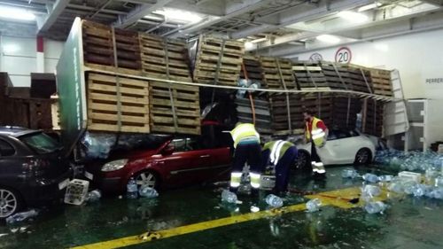 im Schiff geparkter Aufleger mit Trinkwasserflaschen um. Dabei wurden auf dem dortigen Parkdeck mehrere PKW beschädigt, eines der Autos war das des Kapitäns. Personen kamen nicht zu Schaden. Das Schiff kam von Gran Canaria und hatte auf dem Atlantik heftigen Wellengang.