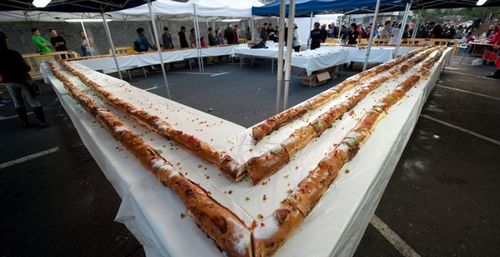 Über 2400 Eier, 75 Kg Zucker, 350 Liter Milch, Vanille Creme sowie Schokoladencreme kamen hier zum Einsatz um den Kuchen zu fertigen.