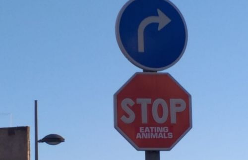 Die lokale Polizei sucht derzeit nach dem oder den Tätern, welche in der letzten Zeit im Stadtgebiet die Stopp Schilder mit einem Zusatzaufkleber versehen. Auf diesem steht “eating animals”. Der ganze Text mit dem Stopp ergibt dann den Sinn : esst keine Tiere.