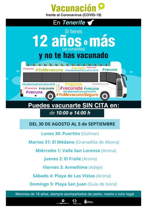 Am Freitag kommt der „Vacuguagua“ nach Adeje. Wer sich auf diese Weise impfen lassen möchte, findet den Bus auf dem Parkplatz vor der Schule von Armeñime. Geimpft wird von 10 bis 14 Uhr und ab zwölf Jahren. Unter 16-Jährige müssen in Begleitung eines Erwachsenen kommen.