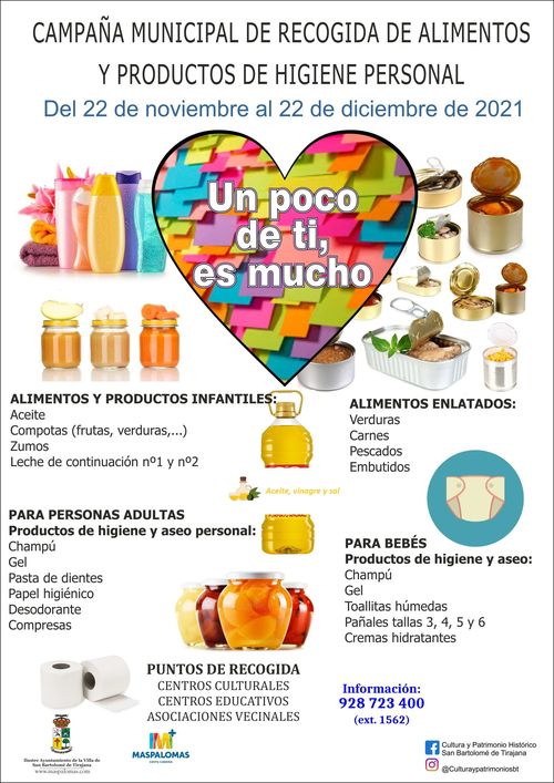 Unter diesem Slogan kann jeder helfen, die Not in einkommensschwachen Familien in San Bartolomé de Tirajana zu lindern. Noch bis zum 22. Dezember werden unverderbliche Spenden wie Kindernahrung, Lebensmittelkonserven sowie Hygieneartikel für Erwachsene und Kinder in den Kulturzentren, Schulen und Nachbarschaftsvereinigungen im Gemeindegebiet entgegengenommen.