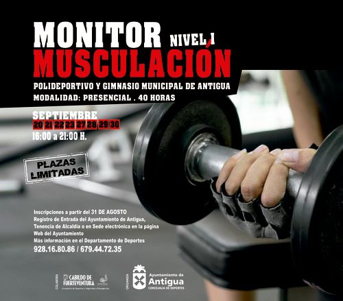 In Antigua wird vom 20. bis 30. September ein Ausbildungskurs zum Muskel-Aufbau-Trainer Stufe Eins angeboten. Damit soll jungen Leuten der Einstieg ins Berufsleben im Sportbereich ermöglicht werden. Anmeldungen werden ab dem 31. August über die Webseite www.ayto-antigua.es angenommen. Infos auch über die Telefonnummern 928 168 086 sowie über 679 44 72 35.