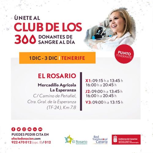 In der Anlage des Bauernmarkts in La Esperanza können Blutspender vom 1. bis 3. Dezember Blut spenden. Termine können über 922 47 00 12 vereinbart werden.