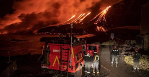 Die neue Lavazunge, die am Mittwoch die Playa de los Guirres in Tazacorte erreicht hat, hat den Strand schon komplett verein-nahmt. Sie droht nun auch eine typisch ka-narische Strandbar, ein Chiringuito, unter sich zu begraben.