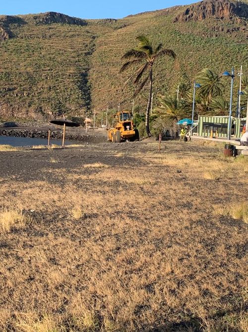 Die Stadt San Sebastián auf La Gomera hat begonnen, die Strände im Stadtgebiet für die Oster- und Sommersaison vorzubereiten. Bagger verteilen derzeit gerade den Sand, sodass eine ebene Fläche entsteht.