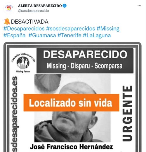 José Francisco Hernández, der seit Donnerstag in La Laguna vermisst wird, ist am Sonntag tot aufgefunden worden. Der 52-Jährige war in der Gegend von Guamasa zuletzt gesehen worden. Über die Todesumstände ist derzeit noch nichts bekannt.