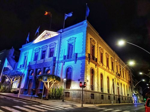 Die Fassade des Rathauses von Santa Cruz leuchtet in den Farben der Ukraine. Damit soll die Solidarität mit den Ukrainern, die unter dem russischen Angriffskrieg leiden und ihren auf Teneriffa lebenden ukrainischen Landsleuten ausgedrückt werden. Auch andere Städte und Gemeinden sowie Inselregierungen haben sich der Initiative angeschlossen.