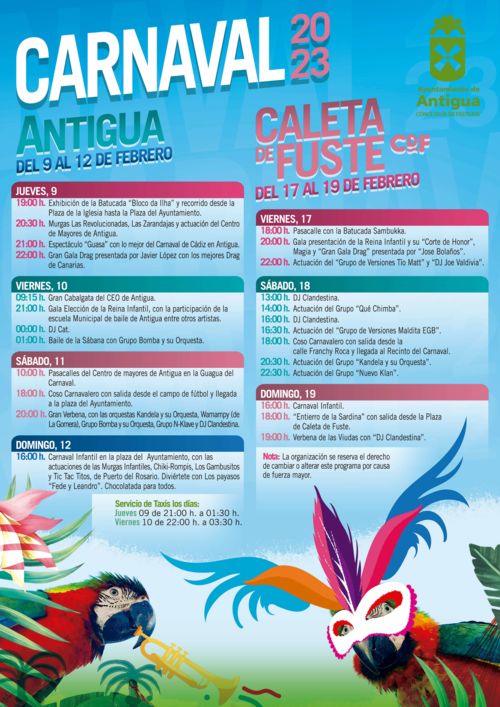 Vom 9. bis 12. Februar wird in Antigua auf Fuerteventura Karneval gefeiert und vom 17. bis 19. Februar im Ortsteil Caleta de Fuste. Er steht in diesem Jahr unter dem Motto „Karibik“. Auf dem Programm stehen Umzüge, Tanzabende, Straßenfeste und Drag-Galas.