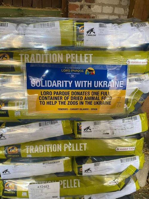 Der Loro Parque erhielt eine Bitte aus dem Zoo in Kiew, in dem dringend um Futterhilfe gebeten wurde. Daraufhin hat der Präsident des Loro Parque, Wolfgang Kiessling, nicht lange gezögert und einen kompletten Container voller Trockenfutter und Pellets auf den Weg geschickt. Die Futtermittel im Wert von 20.000 Euro wurden direkt bei dem Futtermittellieferanten Versele-Laga in Deutschland eingekauft und dann per Zug von Berlin nach Kiew verschickt. Dort sind sie inzwischen angekommen.