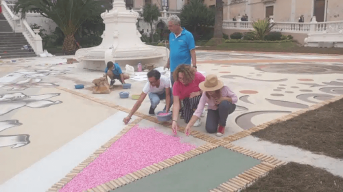 In diesem Jahr wurden in den Sandteppich in La Orotava rosafarbene Plastikteile eingearbeitet, die an die Menschen erinnern sollen, die an Krebs erkrankt sind oder ihn besiegt haben. Die Teppichkünstler luden am Mittwoch vor dem großen Corpus Cristi Tag die Menschen dazu ein, selbst die Teilchen in den Teppich einzufügen. Am Donnerstag ist der große Tag und dieses Mal leider mit einem vom Regen beschädigten Teppich.