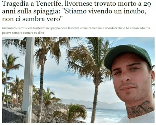 Der erst 29 Jahre alte Gianmarco Fenzi aus Livorno kam nach Teneriffa, um in Los Cristianos als Kellner zu arbeiten. Sein Traum war ein eigenes Restaurant. Doch am 15. Juni wurde er bei Costa Adeje tot aus dem Atlantik geborgen. Nach der gerichtsmedizinischen Untersuchung geht die Polizei von einem natürlichen Tod aus. Es gab keine Anzeichen von Gewaltanwendung. Der Vater des Verstorben ist angereist, um genau zu erfahren, was mit seinem Sohn geschehen ist. Die italienische Tageszeitung „Livorno Today“ trauerte mit der Familie und Freunden.