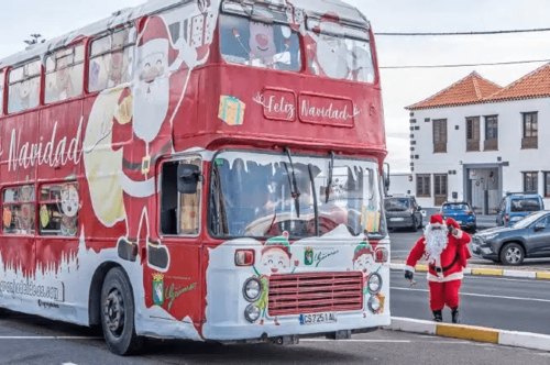 Im Stadtgebiet von Arona ist vom 10. bis 23. Dezember der Weihnachtsmann in einem Doppeldecker-Bus unterwegs. Die Kinder in den einzelnen Ortsteilen können mit ihm sprechen und Fotos machen. Seine Haltestellen: 10 Dezember: 17 bis 20 Uhr, C/ San Sebastián de la Gomera, El Fraile. 11 Dezember: 17 bis 20 Uhr, C/ Flor del Sur, Guargacho. 17. Dezember: 11 bis 14 Uhr C/ Pétalo, Parque La Reina. 17. Dezember: 17 bis 20 Uhr, Parque Paulino Suances Romín, Las Galletas. 18. Dezember: 11 bis 14 Uhr Centro Cultural, Los Cristianos. 18. Dezember: 17 bis 20 Uhr, El Puente, Valle San Lorenzo. 21. Dezember: 17 bis 20 Uhr C/ Oroval, La Camella. 22. Dezember: 17 bis 20 Uhr Centro de Salud, Cabo Blanco. 23. Dezember: 17 bis 20 Uhr Parque infantil, Buzanada.