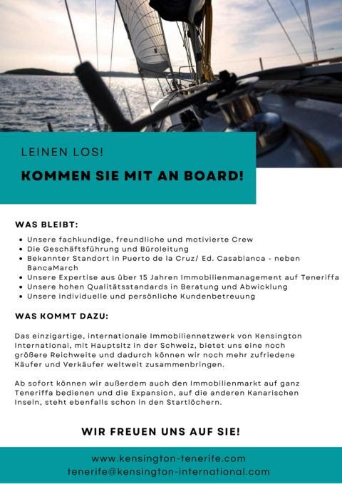 Seit dem 1. Oktober hat Kensington International das ehemalige Büro von Engel & Völkers in Puerto de la Cruz übernommen. Die Ansprechpartner und das motivierte Team sind gleich geblieben. Da sich durch die Umstrukturierung ganz neue Möglichkeiten ergeben, werden Mitarbeitende und Lizenznehmer für Teneriffa und für andere Inseln gesucht. Wer Interesse hat, kann sich gerne an tenerife@kensington-international.com wenden.
