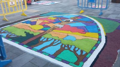 Auch in der Gemeinde Adeje gibt es wunderschöne Teppiche zu bestaunen. Hier wurden von den Einheimischen rund 11.000 Kg Sand verwendet. Dieser wurde zuvor entsprechend eingefärbt, um dann schöne Motive zum Corpus Cristi Fest anzufertigen. 22 Vereine und Schulen beteiligten sich an dieser Arbeit, welche am Wochenende an der Calle Grande und an der Calle Corpus zu sehen sind. PG-AR