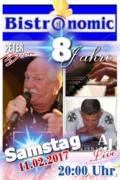 Die Schlagerlegende Peter Boom präsentiert Hits wie Donna Blue, Tulpen aus Amsterdam u.v.a. und Jan Lievaart u.a. mit Songs von den Beatles, Elvis Presley. Am Samstag den 11. Febr. 2017 ab 20:00 Uhr Eintritt 8,88 € Incl. Flying-Fingerfood Jeder Schnaps 88 cent Kleines Bier vom Fass 88 Cent