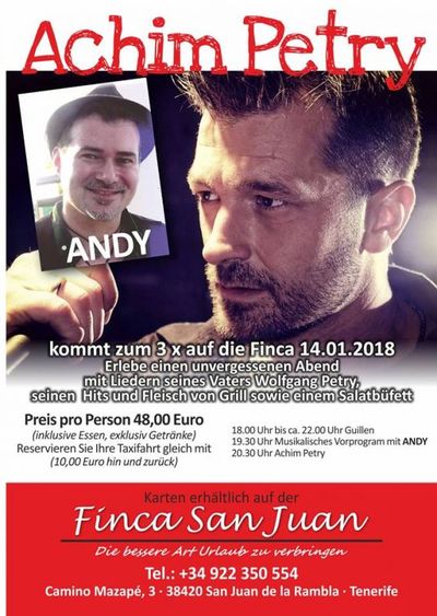 ... und jetzt wieder mit Achim Petry dem Sohn von Wolfgang Petry das Schlagererlebnis auf der Finca San Juan im Norden der Insel Teneriffas bereits zum 3. mal jetzt am 14. Janaur mit einem herrlichen Grill-Abend Reservieren Sie jetzt auf der Finca San Juan, Tel 922 350 554
