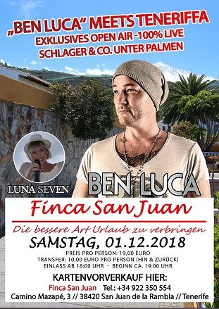 Auf der Finca San Juan gibt es wieder einen Schlagerabend mit Ben Luca am Samstag den 1. Dez.2018 ab 18 Uhr mehr Infos über 922 350 554 Finca San Juan , San Juan de la Rambla