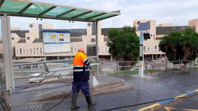 Die Stadt Santa Cruz de Tenerife hat bisher für die Stadtreinigung schon 190.000 Liter Wasser mit 85.000 Liter Desinfektionsmittel zum Einsatz gebracht. Hier sind 17 Mitarbeiter der Stadtreinigung mit großem Gerät im Einsatz um die Straßen und Bushaltestellen zu desinfizieren.