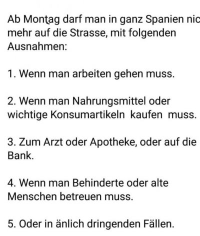 Liebe Landsleute, hiermit möchten wir Sie über aktuelle Maßnahmen in Bezug auf die weltweite Corona-Pandemie informieren. In Spanien wurde am 14. März 2020 aufgrund der Verbreitung von COVID-19 für das gesamte Land der Alarmzustand für zunächst 15 Tage ausgerufen. Dies ist mit einer Reihe von Maßnahmen verbunden, einschließlich bedeutender Einschränkungen der Bewegungsfreiheit im gesamten Land. Die Bewegung im öffentlichen Raum ist nur noch für den Erwerb von Lebensmitteln, pharmazeutischer Produkte und Produkten zur Sicherung von Grundbedürfnissen, Arzt- und Krankenhausbesuchen, zur Arbeitsstätte und zur Rückkehr an den Ort des gewöhnlichen Aufenthalts, zur Unterstützung von Senioren, Minderjährigen, Abhängigen, Behinderten und besonders gefährdeten Personen, zu Banken und Versicherungen, aus Gründen höherer Gewalt oder einer Notwendigkeit ähnlicher Natur erlaubt. Dies gilt auch für die Fortbewegung in Fahrzeugen. Es kann nicht ausgeschlossen werden, dass Straßen gesperrt werden. Das Angebot an öffentlichen Verkehrsmitteln im innerspanischen Verkehr (Flug-, Schienen- Straßen- und Schiffsverkehr) soll halbiert werden. Die spanischen Flughäfen sind geöffnet, allerdings reduzieren Fluglinien derzeit ihre Flugangebote. Spanische Häfen sind für Kreuzfahrtschiffe gesperrt. Die meisten Geschäfte sind geschlossen, mit Ausnahmen u.a. für Lebensmittelgeschäfte und Apotheken. Weiterhin werden Bildungs-, Kultur- und sämtliche Freizeit- und Sporteinrichtungen sowie Gaststätten in ganz Spanien geschlossen. Für Hotelbetriebe ist mit Einschränkungen zu rechnen. Gesundheitsmaßnahmen nach einem Notfallplan reichen von Gesundheitskontrollen mit Temperaturmessungen bis zu häuslicher Quarantäne. Spanische Gesundheitseinrichtungen werden durch COVID-19 stark in Anspruch genommen, so dass bei der medizinischen Versorgung außerhalb von Notfällen mit Einschränkungen gerechnet werden muss. Besonders betroffene Autonome Gemeinschaften (Comunidad Autónoma) können auch weitreichendere Maßnahmen ergreifen. Im Landesinneren von Katalonien wurden die Gemeinden Igualada, Odena, Vilanova del Cami und Santa Margarida de Montbui abgeriegelt und können weder betreten noch verlassen werden. In der Region La Rioja werden Hotels geschlossen. Die Hauptstadt Madrid wurde vom Robert-Koch-Institut zum Risikogebiet erklärt. Überprüfen Sie Ihre Reisepläne und verschieben Sie nicht erforderliche Reisen. Erkundigen Sie sich über mögliche Änderungen im Reiseplan bei Ihrem Reiseveranstalter oder Ihrer Fluggesellschaft. Informieren Sie sich zu den aktuellen Maßnahmen in Spanien auf der Homepage des spanischen Gesundheitsministerium sowie der jeweiligen Autonomen Gemeinschaft und folgen Sie den Anweisungen und Empfehlungen der Behörden. Beachten Sie die Informationen im Merkblatt COVID-19 sowie auf den Seiten der Weltgesundheitsorganisation WHO und des Robert Koch-Instituts RKI sowie unsere fortlaufend aktualisierten Informationen zu COVID-19 /Coronavirus. Die aktuellen Reisehinweise des Auswärtigen Amtes zu Spanien können Sie jederzeit unter https://www.auswaertiges-amt.de/de/aussenpolitik/laender/spanien-node/spaniensicherheit/210534 einsehen. Mit freundlichen Grüßen Deutsches Konsulat Las Palmas de Gran Canaria
