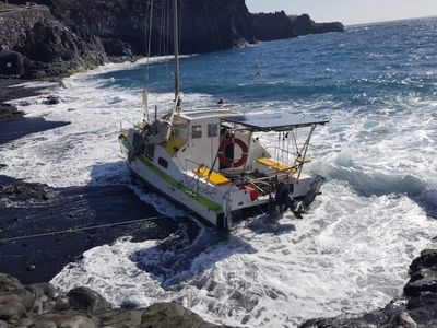 Auf der Insel La Palma wurde an der Playa Charco Verde in der Gemeinde Los Llanos de Aridane gegen 13 Uhr am Neujahrstag ein von den Wellen manövrierunfähiger Katamaran an die Küste geschoben.