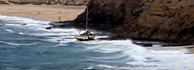 In dem Sturm am Dienstag wurde ein Katamaran vor Lanzarote von dem heftigen Wellengang und dem Wind erfasst und an den Strand Playa de Papagayo gedrückt. Der Katamaran lief auf die Felsen auf. Die Besatzung konnten sich retten.