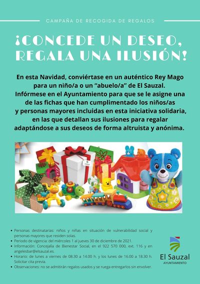 Bis zum 30. Dezember können sich Spendenwillige an der Geschenkaktion des Rathauses beteiligen. Kein Kind soll ohne Geschenk bleiben. Deshalb werden Spielsachen für Kinder aller Altersklassen eingesammelt. Neu ist in diesem Jahr, dass man sich auch an die älteren, allein lebenden Menschen erinnert. Auch sie sollen an Weihnachten ein Geschenk bekommen. Wer mitmachen möchte, kann sich am Sozialamt in El Sauzal melden und erhält dann einen Wunschzettel.
