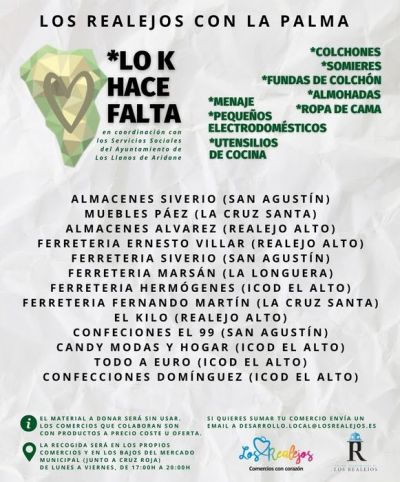 In engem Kontakt mit den Sozialämtern vor Ort hat die Stadträtin Macarena Hernández in Los Realejos eine Solidaritätsaktion ins Leben gerufen. Alles, was man in einem Haushalt gebrauchen kann, kann in kooperierenden Geschäften zum Selbstkostenpreis oder stark reduziert erworben und für La Palma gespendet werden. Die Spenden können an Werktagen von 17 bis 20 Uhr in Mercado Municipal abgegeben werden.