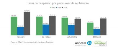 Der Hotel- und Ferienverband Ashotel der Provinz Teneriffa berichtet von leichtem Aufwind. Die Belegungszahlen im September erreichten auf Teneriffa 55 Prozent Belegung, auf La Palma fast 56, auf La Gomera knapp 52 und auf El Hierro etwa 38. Auf La Gomera war die Belegung sogar höher als im Jahr 2019 und auf La Palma wurde fast das Niveau von 2019 erreicht. Auf den anderen Inseln muss schon noch ein Zuwachs kommen um auf das Vor-Corona-Niveau zu erreichen.