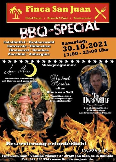 Haben Sie mal wieder Lust auf einen richtig erfüllten Abend? Dann ist das große BBQ-Special auf der Finca San Juan am 30. Oktober ein unbedingtes Muss. Es gibt Fleisch, Gambas, Würstchen und Gemüse vom Grill. Dazu ein Salatbüfett, ein tolles Unterhaltungsprogramm mit Luna Seven, Alma van Satt und Tom Darkwolf. Und das Ganze für 19,50 Euro. Am besten gleich den Platz reservieren! Telefon 922 35 05 54.