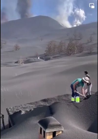 Manche Hänge auf La Palma, die von der Lava verschont wurden, sehen aus wie eine skurrile Landschaft. Alles ist schwarz vom Aschestaub. Dazwischen schauen einzelne Dächer und Schornsteine aus der Aschewüste. Und genau dort sind die Soldaten im Einsatz, die versuchen, Häuser und Dächer freizuschaufeln, um sie vor dem Einsturz zu bewahren. Eine mühevolle und nicht ungefährliche Arbeit.