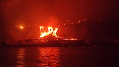 Am Freitagabend hat sich vom Hauptlavastrom ein Nebenzweig abgegabelt und floss ab 21.10 Uhr bei Tazacorte. Die Stelle liegt neben der Stelle, an der sich im Laufe der Woche schon eine 500 Meter breite Lavazunge gebildet hat. Die Forscherin Olga Sánchez hat den neuen Lavastrom, der das Meer erreichte, vom Forschungsschiff „Ramón Margalef“ des Ozeanographischen Instituts aus aufgenommen.